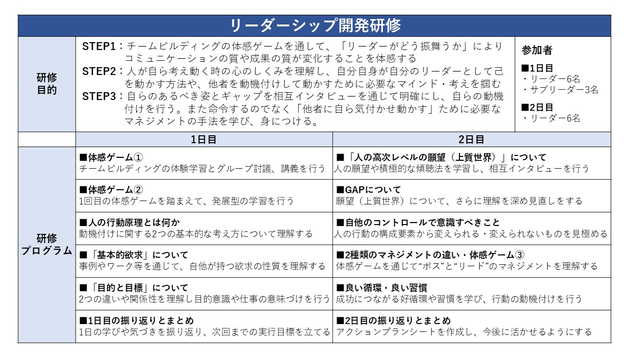 この度の研修では、「メンバーのやる気や主体性、協力を引き出すマネジメントを学び、リーダーシップ向上を図ること」を目的に据え、そのほかの経営的な判断力を高めるための学習は、今後計画的に別途行っていく形で設計しました。