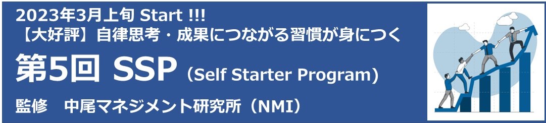 中尾マネジメント研究所(NMI)監修、仕事ができる人の習慣(セルフマネジメント)を身につけ、成果を出すための習慣と思考を定着させるための研修プログラム「SSP」。