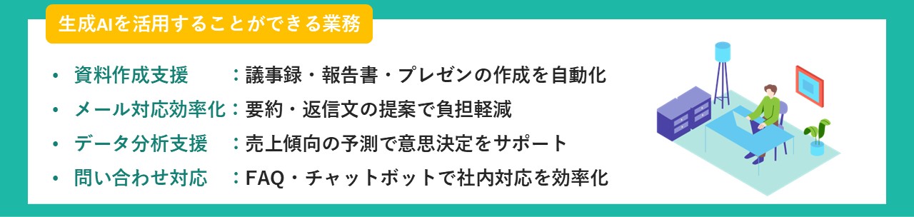 ミドルマネジメント層においては、次のような業務に生成AIを活用することで、大幅な業務効率化が期待できます。
