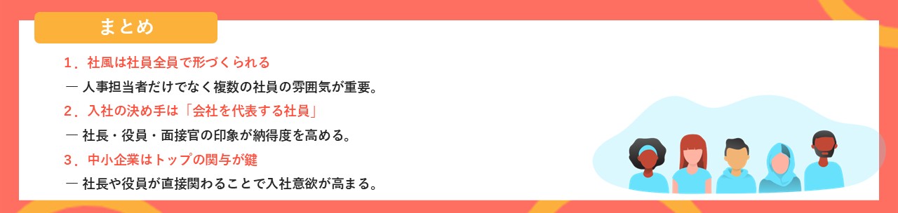 この結果から、中小企業においては社長や役員といった会社の顔となる人が内々定者に関わることが特に重要です。