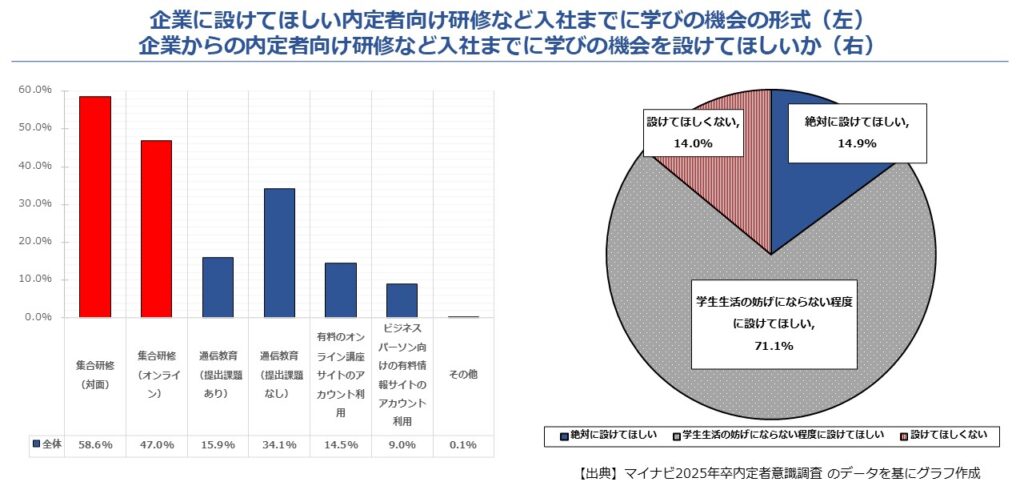 「企業に設けてほしい入社前研修」については、 集合研修(対面・オンライン)が上位 を占めました(図3・左)。