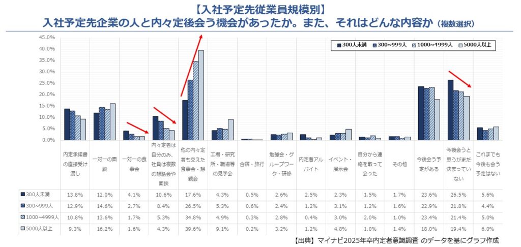 企業規模が小さいほど 内定者同士の交流は少なく、一対一の場が中心 になる傾向が見られました(図1)。